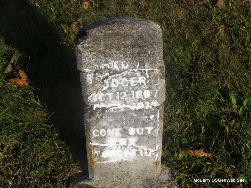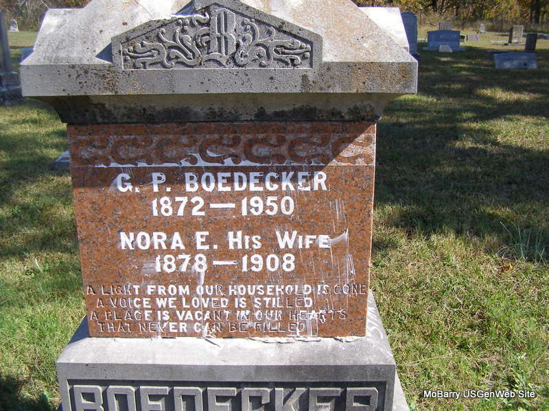 | BOEDECKER, George Pleasant | July 27, 1872 | June 20, 1950 | SSW: Nora E. - Research Note: George second married Cora E. Fly on Mar. 28, 1914 in Barry Co., MO, buried at Purdy Cemetery. Son of Henry A. Boedecker and Susan J. Ripley, married on Aug. 17, 1871 in Barry Co., MO. Grandson of James and Nancy Ripley. Susan second married John David Stephenson. - 1880 Census, Capps Creek Twp., Barry Co., Missouri - Nancy Ripley, Self, Widowed, Female, White, 65, KY, Keeping House, NJ, KY; John A. Ripley, Son, S, Male, White, 32, AR, Farmer, VA, KY; George W. Ripley, Son, S, Male, White, 30, AR, School Teacher, VA, KY; Septimus Ripley, Son, S, Male, White, 25, AR, Farmer, VA, KY; Susan J. Boedecker, Dau, Married, Female, White, 33, AR, Housekeeper, VA, KY; George P. Boedecker, Grand-Son, S, Male, White, 7, MO, At School, Prussia, AR; James P. Boedecker, Grand-Son, S, Male, White, 6, KS, At School, Prussia, AR. - Notes by Lynetta at findagrave.com: George Pleasant Boedecker married Nora E. Montgomery August 25, 1897 in Arkansas they had three children; Lola Boedecker, James Samuel Boedecker and Noma Rebecca Boedecker. A child named Nettie Boedecker buried at Concord Cemetery may also be George Pleasant and Nora's child. After Nora's death George Pleasant Boedecker married Cora E. Fly March 28, 1914. George Pleasant is the brother to James P. Boedecker and John L. Boedecker. Missouri vital records lists George Pleasant Boedecker as a retired railroad employee. He was employed by the Frisco. | Census MO Marriage Records Phyllis Long Photo Ralph & Betty Lamberson |