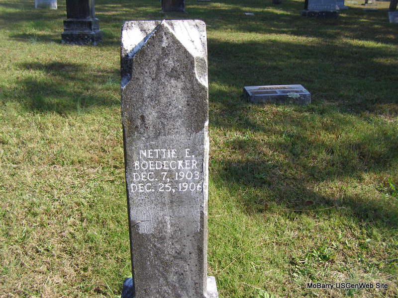 | BOEDECKER, Nettie E. | Dec. 7, 1903 | Dec. 25, 1906 | Research Note: Probably the daughter of George P. and Nora E. (Montgomery) Boedecker. | Note Phyllis Long Photo Ralph & Betty Lamberson |