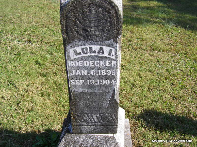 | BOEDECKER, Lola I. | Jan. 6, 1899 | Sept. 13, 1904 | Research Note: Daughter of George P. and Nora E. (Montgomery) Boedecker. | Census Phyllis Long Photo Ralph & Betty Lamberson |
