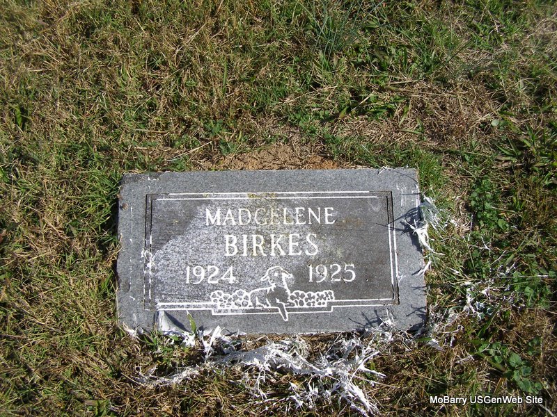 | BIRKES, Fay | Sept. 7, 1905 | July 17, 1907 | Inscription: "Our Darling - Dau. of W. R. & M. A."- Daughter of William Riley Birkes and Martha A. Patton. | Note Phyllis Long Photo Ralph & Betty Lamberson |