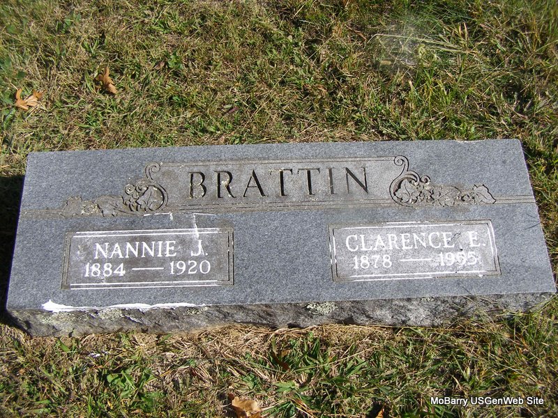 SSW: Nannie J. - Research Note: He was a son of Thomas Haywood and Sarah E. (Peach) Brattin. Roy Brattin of Seneca, MO was the informant on the death certificate. - Another Photo | Death Certificate Phyllis Long Family Photo Frances Albert Headstone Beverly Matthews Photo Ralph & Betty Lamberson |