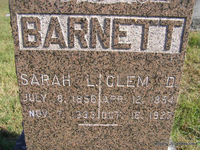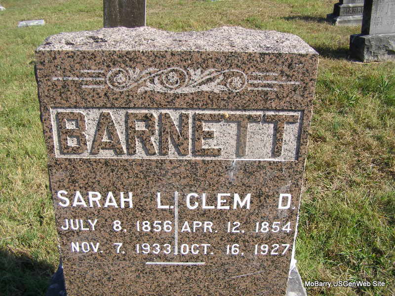 | BARNETT, Clement "Clem" D. | Apr. 12, 1854 | Oct. 16, 1927 | SSW: Sarah L. - Research Note: Son of Dennis Dunham and Mary Elizabeth (Wood) Barnett. - Another Photo | Census Phyllis Long Photos Ralph & Betty Lamberson |