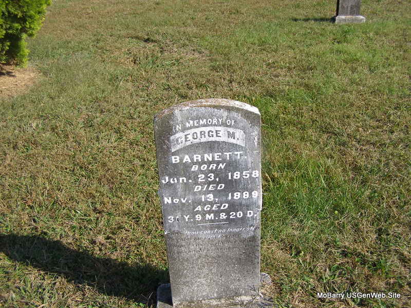 | BARNETT, George Marion | June 23, 1858 | Nov. 13, 1889 | Inscription: "Aged 30 Y. 9 M. 20 D." - Research Note: Son of Dennis D. and Mary (Wood) Barnett. His wife was Sophronia J. Davidson, married on Jan. 11, 1885 in Barry Co., MO. At age 35, Sophronia married David H. Lamberson, age 45 on Nov. 12, 1893 in Barry Co., MO. | Census MO Marriage Records Phyllis Long Photo Ralph & Betty Lamberson |