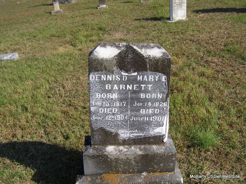 SSW: Mary E. - Research Note: Cassville Democrat, Cassville, June 18, 1904- Death carried away a highly respected and old citizen in the person of Dennis Barnett, at his home, in Liberty township, June 12, age 87 years, a few months, and days. He was the father of 13 children, all living but two. He had been a member of the Baptist Church nearly all his life. His remains were laid to rest in Concord Cemetery. His aged wife survives him. One day later his son, Bevy Barnett, aged about 50 years old died of typhoid fever, leaving a wife and five children to mourn his death. He was a member of the C. P. Church and a splendid citizen. His remains were interred in the Chitwood Cemetery there to await the resurrection summons. | Cassville Democrat Online Newspapers Phyllis Long Photo Ralph & Betty Lamberson |