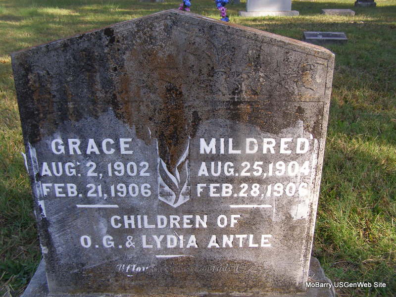 | ANTLE, Grace | Aug. 2, 1902 | Feb. 21, 1906 | SSW: Mildred - Inscription: "Children of O. G. and Lydia Antle" - Stan's Research Note: Grace was probably a child of Oliver G. and Lydia (Montgomery) Antle that are buried in Maplewood Cemetery. | Headstone Cheryl Census Records Stan McKay Photo Ralph & Betty Lamberson |