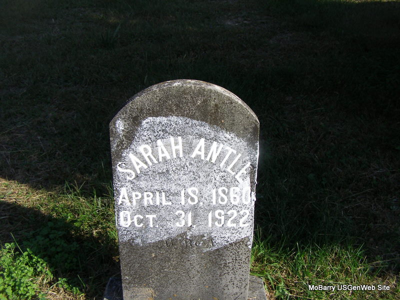 Inscription: "Mother Sarah, Wife of Jacob Antle - Aged 80 yrs, 1 mos, 18 days" - Research Note: Cassville Republican, Jan. 11, 1894 - An Aged Couple: Mr. Cull Antle of Exeter has handed us the following memorandum of his parents, probably the oldest couple in the county. Jacob Antle was born in Adair Co., KY, March 5, 1813. In 1853 he married Mrs. Antle who was born in Russell Co., KY, April 12, 1816. Mr. Antle came to Barry from Buchanan Co., MO, in 1854. Of their twelve children, all are living but one; grand children, fifty living and eleven dead; great grandchildren, ten living and two dead. | Headstone Cheryl Headstone Beverly Matthews Cassville Republican Stan McKay |