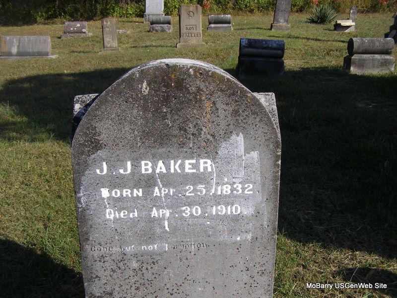 Research Note: Son of John and Sarah (Clusons) Baker, both born VA. He was widowed and Sarah Antle of Wheaton, MO was the informant on the death certificate. - Might be this John : October 21, 1909, Cassville Republican - John Baker had an attack of heart trouble Tuesday morning near the mill while going to feed his hogs in the lot at the canning factory. He fell unconscious and probably would have died had he not been discovered at once by S. W. Beaver who was watering his horse at the creek. Beaver, joined by Dave Dingler and Henry Kerrick carried him to the City Hotel where he soon recovered consciousness. He was confined to his bed during the day but is now out again. - Cassville Republican May 18, 1911 - Probate Court Proceedings: Dodge McGlothin, administrator, made report of partial distribution of J. J. Baker as follows: John Baker, Nancy Howard, Nancy Antle and Maud Howard were each given $200. | Death Certificate Online Newspapers Phyllis Long Photo Ralph & Betty Lamberson |