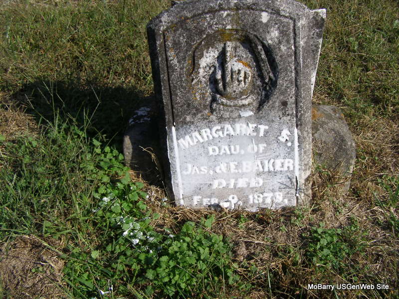 | BAKER, Margaret S. | Abt. 1857 | Feb. 9, 1878 | Inscription: "Age 21 Yrs. 4 Mos. 1 day, dau. of Jas. and E." - Research Note: This stone is broken and so the bottom part is missing, which gives her age. Daughter of John James and Elizabeth Baker. | Photo Ralph & Betty Lamberson |
