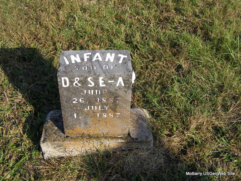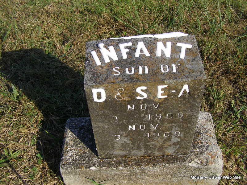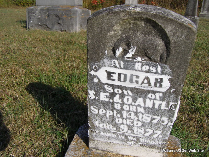 | ANTLE, Edgar | Sept. 14, 1875 | Jan. 9, 1877 | Inscription: "Son of S. E. and O. Antle" | Photo Ralph & Betty Lamberson |