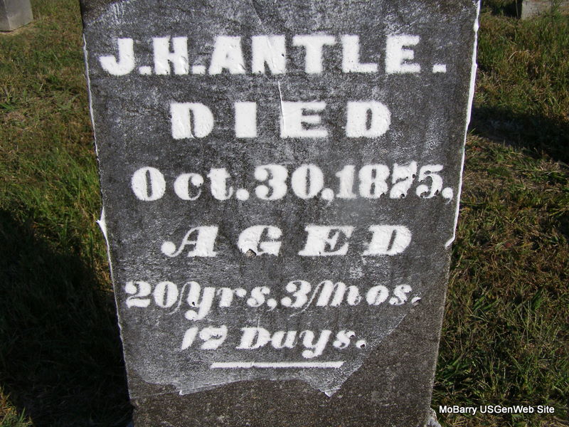 | ANTLE, J. H. | Abt. 1854 | Oct. 30, 1875 | Inscription: "Aged: 20 yrs, 3 mos, 17 days" - Research Note: Stan's Note: J. H. is probably James H. a son of Jacob and Sarah Stepp and born about 1854 in MO. - Back of Stone | Headstone Cheryl Census Records Stan McKay Photos Ralph & Betty Lamberson |