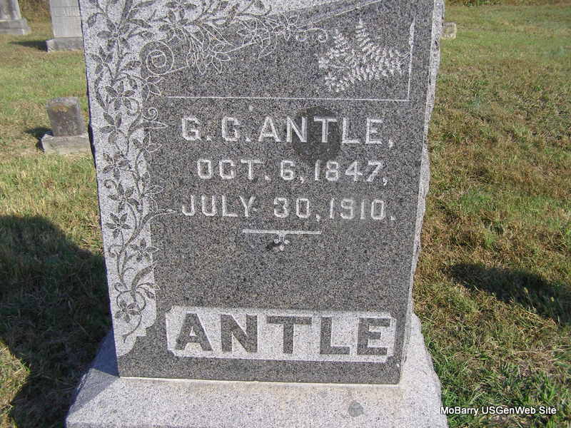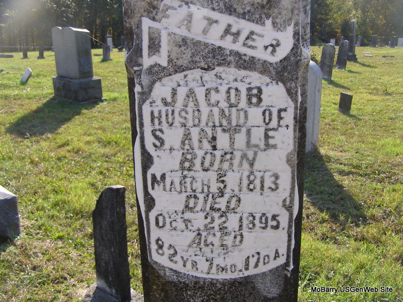 Inscription: "Father - Jacob, Husband of S. Antle 82 yrs, 7 mos, 17 days" - Research Note: Cheryl posted 3 months - stone reads 7 months. Stan's Note: Jacob was a son of Henry and Polly (Simmons) Antle. He married Sarah Stapp or Stepp about 1836 in KY. About 1851 he moved to the Saint Joseph area of MO where his oldest brother Everhart was. In 1855 he moved to Barry Co. joining his sister Elmira (Antle) Hadley and her husband Henry. Another sister Sarah (Antle) Grant and her husband James also came to Barry Co. about this time. - Cassville Republican, Jan. 11, 1894 - Mr. Cull Antle of Exeter has handed us the following memorandum of his parents, probably the oldest couple in the county. Jacob Antle was born in Adair Co., KY, March 5, 1813. In 1855, he married Mrs. Antle, who was born in Russell Co., KY, April 12, 1816. Mr. Antle came to Barry from Buchanan Co., MO, in 1854. Of their twelve children, all are living but one; grandchildren, fifty living and eleven dead; great grandchildren, ten living and two dead. | Online Obit Headstone Cheryl Census Records, Adair Co., KY court record, Goodspeed's History of Barry County pg 151, Barry County Genweb Stan McKay Photo Ralph & Betty Lamberson |
