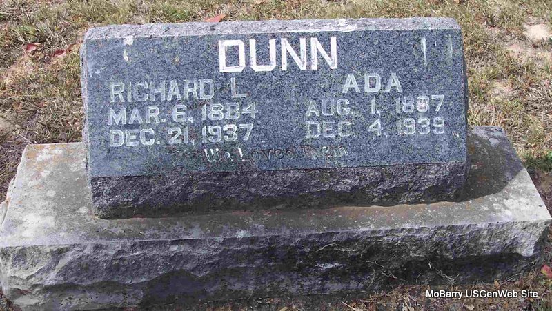 SSW: Ada - Inscription: "We Loved Them" - Research Note: Son of Henry Dunn born Polk Co., MO and Mary Forester. Ada, his wife, was the informant on the death certificate. - September 10, 1914, Cassville Republican - Milwaukee News: Richard Dunn and wife visited his brother, Ed and children near Mt. Sinai Saturday night and Sunday. | Death Certificate Donna Cooper Online Newspapers Phyllis Long Photo Diana Cope |