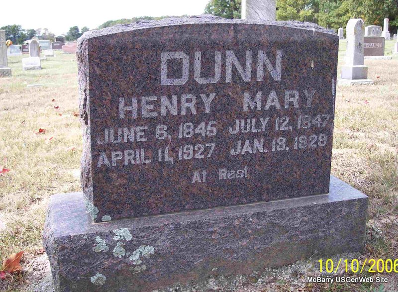 SSW: Mary - Research Note: His death certificate reads that he died April 11, 1929, not 1927 as the stone reads. His mother's maiden name was Carter. Information was given by Mrs. Charles Hefley. - Cassville Democrat, April 19, 1929 - UNCLE HENRY DUNN PASSES AWAY THURSDAY, AGE 83: Henry David Dunn was born in Springfield, Mo., June 6th 1845, departed this life at his home in the Pasley neighborhood, south of Cassville, April 11, 1929, age 83 years, 10 months and 5 days. He suffered a stoke of paralysis about eight years ago, and has been in falling health since that time. He had been confined to his bed for about eight weeks. The family has resided in the Pasley community for 34 years, formerly living on Washburn Prairie. On August 15, 1867 he and Miss Mary A. Forester were married. To this union eight children were born, three of them dying in infancy, one daughter, Mrs. Minnie Hunt passed away Nov. 23, 1918. The children who are living are, W. E. Dunn of Cassville. Mrs. J. S. Hopkins, living in the Pasley community, Mrs. Lillie Hefley of Cassville, and R. L. Dunn, who with his wife made their home with Mr. And Mrs. Dunn. Beside his wife and children, he leaves fifteen grandchildren and eight great grandchildren and a host of other relatives and friends to mourn his death. Mr. Dunn was converted about thirty years ago, but did not unite with the church until about two years ago. He was baptized into the fellowship of Corinth church, on August 23, 1927, by Chas Vanzandt. During his last sickness he spoke often of his demise and assured his friends of his readiness to go. Mr. Dunn was a good neighbor and was always ready to render assistance to those in need. Funeral services were conducted at the home on Friday afternoon. April 12, 1929 by Chas Vanzandt. A large assembly of neighbors and friends gathered to pay their last tribute of respect. Members of the I.O.O.F. lodge from Seligman, Purdy, Washburn, Cassville and other places held services at the grave in the Corinth cemetery. Mr. Dunn has been a member of this lodge for fifty-two years. Hankins Funeral Directors had charge. Uncle Henry was a lovable character and he with his estimable wife had carried off honors in various contests held throughout this section for being the oldest married couple present. He raised a splendid family and in his declining days, greatly enjoyed meeting and talking with his old time acquaintances. He was an honest man, always lending a helping hand to the unfortunates and distressed. A few months ago he and his good wife enjoyed a trip to the Odd Fellows home. He was one of the oldest members of that order in this section and never ceased telling his many friends of the fine trip and courteous treatment afforded him on that trip. The county has lost one of it best citizens and the Democrat joins the many friends of the grief stricken family in extending sympathy in their sad hour of bereavement. - May 15, 1913, Cassville Republican - Milwaukee News: Henry Dunn and wife visited their son, Ed and children, Saturday night and Sunday, near Mt. Sinai. - May 29, 1913, Cassville Republican - Washburn Prairie News: Chas. Heffley and family visited Mrs. Heffley's father, Henry Dunn, Sunday, and attended church at Corinth. - June 12, 1913, Cassville Republican - Washburn Prairie News: Henry Dunn and wife of Corinth spent Sunday with their son-in-law, Chas. Heffley, and family at this place. | Death Certificate Donna Cooper Online Obit Online Newspapers Phyllis Long Photo Diana Cope |