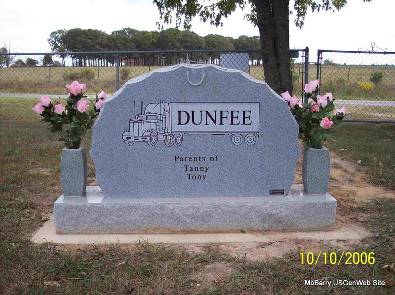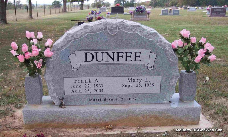 SSW: Mary L. - Inscription:"Married Sept. 25, 1957" - Research Note: He was the son of John and Divida (Pagile) Dunfee. He was a truck driver, driving for Joy Beck out of Cassville, Ocoma Foods, now Tyson Foods, and Dunfee and Son Trucking. He married Mary Louise Hopkins. - Back of Stone | Monett Times Phyllis Long Photo Diana Cope |