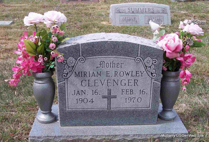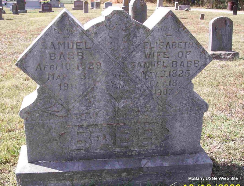 SSW: Samuel - Research Note: Note from Rod Hefley, Atchison, Kansas - Elizabeth (Roberts) Babb died in Savannah Missouri. There was a cancer treatment center there. Daughter of Claiborne Roberts and Milly Bloomer. - Cassville Democrat, October 5, 1907 - Mrs. Dock Hefley of near town went to Stotts City, Thursday morning to attend her mother, Mrs. Sam'l Babb, who is growing worse and is now unable to swallow. | Headstone Jan McClintock Online Newspapers Phyllis Long Photo Diana Cope |