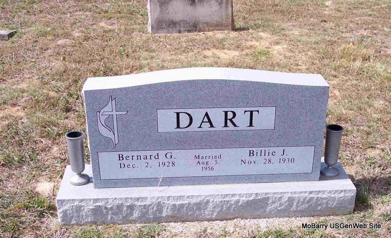 SSW: Billie J. - Inscription:"Married Aug. 5, 1956" - Research Note: He was a rural Cassville, MO resident and a son of Lonnie and Margaret (O'Neill) Dart. On August 5, 1956, he was united in marriage to Billie Anderson. During the Korean War he served his country in the United States Army. For a few years he was a barber and then worked eighteen years for St. Mary Rogers Memorial Hospital. Most of his life was spent farming, raising cattle. He was a member of Washburn United Methodist Church, where he was a trustee. Since around 1991, he served on the South Barry County Ambulance Board. He loved playing music and groups played at their home every other Saturday. | Fohn Funeral Home Phyllis Long Photo Diana Cope |