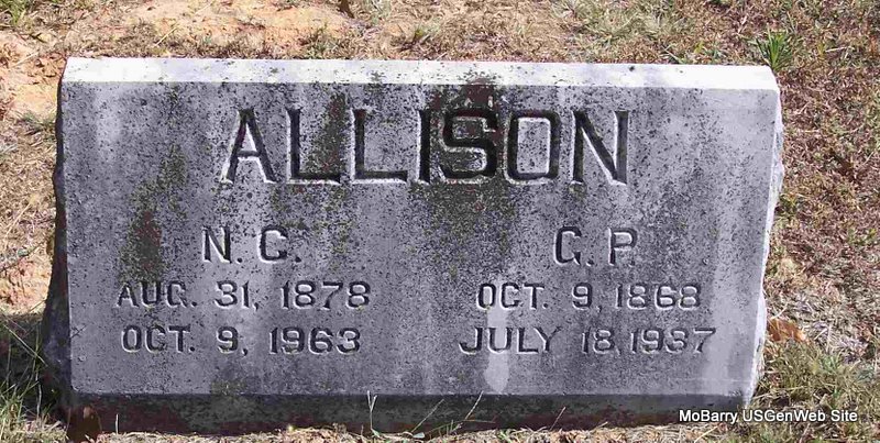 SSW: N. C. - Research Note: His wife when he died was Tina Allison. He was a stone cutter for a monument company. Son of James Warren Allison born KY and Mary Ann Wright born TN. Roy Craig of Rural Cassville, MO was the informant on the death certificate. Gabriel P. Allison married Margaret Longley, May 1, 1891, in Barry Co., MO, and were married by David A. Cole, Minister of the Gospel. Gabriel was age 24 and Margaret was age 23. - Information at ancestry.com says Margaret died in 1888 and is buried at Washburn Prairie but she is not listed. Might not have a stone. According to the 1910 Census, Gabriel had been married twice, currently married to Nancy C. "Tina" for 13 years. She was the mother of 5 children, 2 living. Gabriel was 40 years old, married twice, and Tina 30, married once. Children Myrtle, age 12 and Nadine J., age 2. | Death Certificate MO Marriage Records Census Phyllis Long Photo Diana Cope |