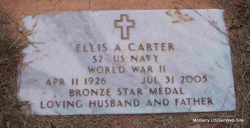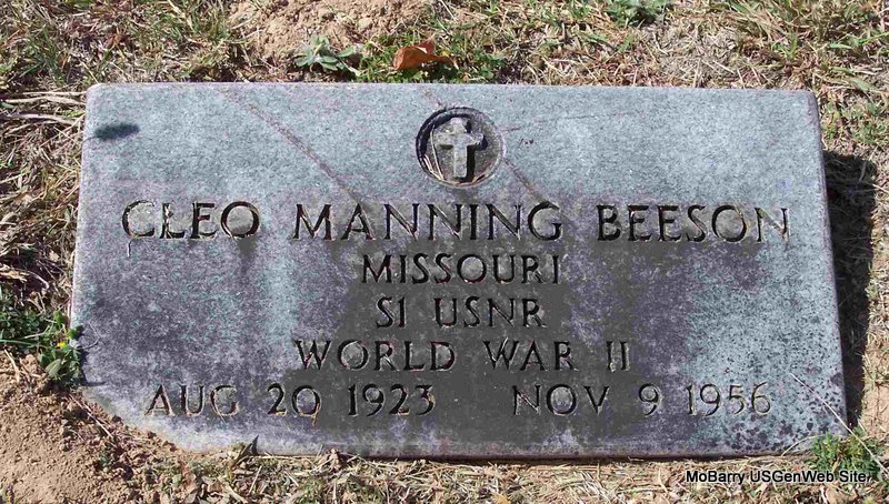 Inscription: "MISSOURI S1 USNR WORLD WAR II" - Research Note: He was married to Edna Meryl Smalley, after his death she married Ora Olen Painter. - Usual residence was Lockwood, MO. Son of Roy Kenneth Beeson and Josephine Della Morgan. Mrs. Cleo Beeson of Rural Lockwood, MO was the informant on the death certificate. He was found dead in a truck at home. Cause of death was acute alcoholism with questionable carbon monoxide poisoning. Pathologist report performed on Nov. 10, 1956. Autopsied by Dr. F. C. Coller of Springfield, MO. | Note Beverly Matthews Death Certificate Phyllis Long Photo Diana Cope |