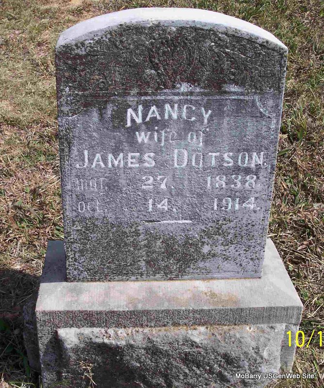 Inscription: "Wife of James" - Research Note: There is very little information on the death certificate. She was widowed and father's name was Slane. J. R. Fogg of Cassville, MO, was the informant. Buried at Pasley Cemetery. In the 1850 Census, District 97, Rush, Indiana, she is with Samuel and Elizabeth Davis. Apparently, her mother was Elizabeth and remarried to Davis after Mr. Slane died. - Cassville Republican, October 22, 1914 - Died Thursday: Mrs. Nancy Dotson, who for a number of years has resided in the Pasley locality, passed peacefully away at the home of her daughter, Mrs. W. A. Fogg, Thursday morning, Oct. 15, 1914. Death was due to complication of diseases brought about by old age. The deceased was born in Rush County, Indiana, in 1838. In 1851, she was married to James Dotson, deceased. To them were born four children, three daughters and one son. Mrs. Dotson has been a citizen of this county since 1871, during which time she enjoyed the confidence of her acquaintances. She was a member of the Christian Church and was one of our noblest and best citizens. Funeral services were held Thursday afternoon at the Corinth Baptist church conducted by Rev. E. W. Love and her body laid to rest in the Corinth Cemetery. | Death Certificate Online Obit Census Phyllis Long Photo Diana Cope |