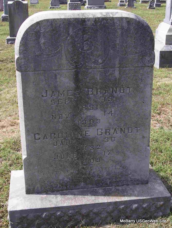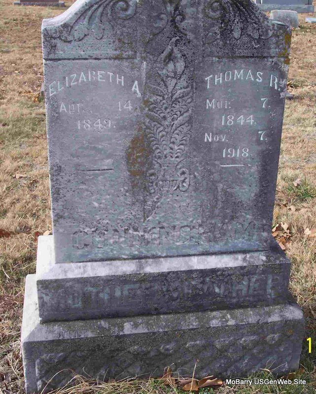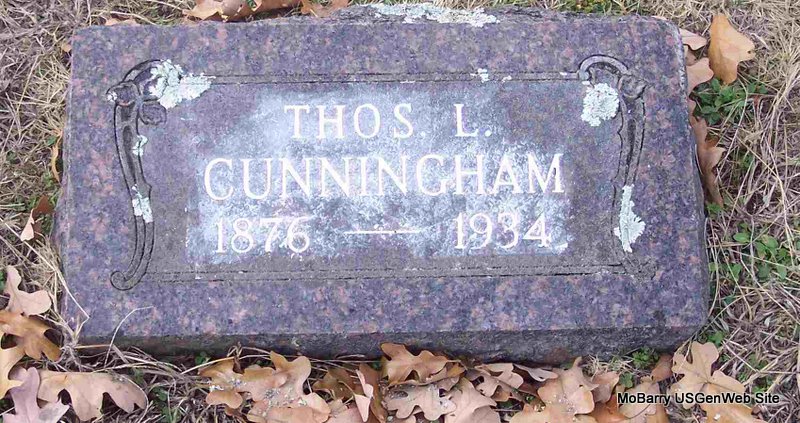 SSW: Elizabeth A. - Research Note: Son of Robert Christopher and Rebecca Cunningham. - Cassville Republican, Nov. 14, 1918 - Thomas Cunningham Dies Suddenly: Thomas R. Cunningham died suddenly at his home south of Cassville in the Pasley locality, Thursday morning at 10:30 o'clock following a stroke of paralysis, at the age of 74 years and 8 months. He was stricken about 8 o'clock that morning and lived only two and one-half hours after the stroke. He arose and ate his breakfast as usual and appeared to be feeling well. He had been in Cassville frequently and his friends and his associates could see no indication of failing health. He was of a rugged physique and for a man of his years seemed to be vigorous and strong. Thomas R. Cunningham was born in Buchanan county, Missouri, March 7, 1844. He grew to manhood and married there. In 1884 he moved to this county and had lived in the Vanzandt and Pasley locatives ever since. Eight children were born to Mr. and Mrs. Cunningham, six of whom, three sons and three daughters, are living as is also Mrs. Cunningham. The children are George, Lark and Willie, the latter being now in France; Mrs. George VanDorn, Mrs. Will Brandt and Maud who is at home. Funeral services were held Friday afternoon and interment made at the Corinth cemetery. In his death Barry County loses a splendid man. | Online Newspapers Census Phyllis Long Photo Diana Cope |