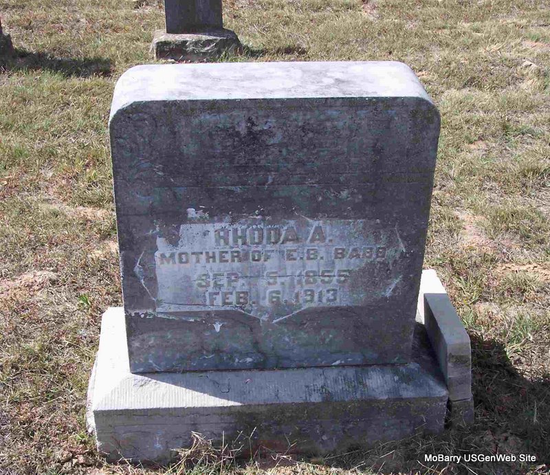 Inscription: "Mother of E. B. Babb" - Research Note: She was a daughter of Samuel and Elizabeth (Roberts) Babb. - Cassville Republican, February 6, 1913 - After many years of intense suffering from dropsy, rheumatism and other diseases Rhoda Babb, daughter of the late Rev. Samuel and Elizabeth Babb passed away Thursday evening of last week at the home of her son, Emmett B. Babb, in Washburn. The deceased was born in Hancock County, Tenn., about 67 years ago and came with her parents to Missouri in 1879. Her parents settled near Washburn and later lived in Cassville where she grew to womanhood. Early in life she became a member of the Methodist church and had lived a consistent member until death. She is also survived by four sisters and two brothers: Mrs. Sarah Lowder of Cassville, Joe Babb of Grant, Okla., Mrs. Mattie Wallen of Fairland, Okla., Mrs. Tina Bradley of Miami, Okla., M. B. Babb of Cassville. Funeral service were conducted Friday afternoon at the Corinth Church and interment made in the Corinth Cemetery. | Online Obit Phyllis Long Photo Diana Cope |