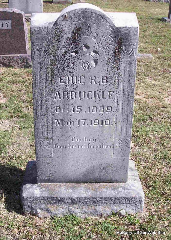 Research Note: Son of Washington M. and Lou V. Arbuckle. - May 26, 1910, Cassville Republican, Barry Co., MO - Pasley News: We are sorry to hear of the death of Mr. Arbuckle's son, we sympathize with them. - Same paper: Erle Arbuckle, nineteen year old son of Mr. and Mrs. Wm. Arbuckle of near Roaring River spring died last Wednesday, May 18th, and was interred Thursday at the Corinth Cemetery. He had been afflicted for several years and the family had done all in their power to have successfully treated but failed to get him benefited. The family lived in Cassville about two years ago. | Online Newspapers Census Phyllis Long Photo Diana Cope |