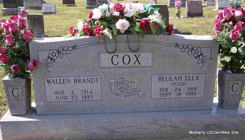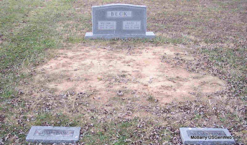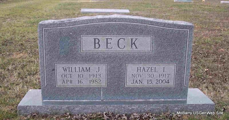 | BECK, William J. | Oct. 10, 1913 | Apr. 16, 1982 | SSW: Hazel I. - Research Note: Son of Asa O. Beck and Lillie L. Loftin. William Beck, age 22, married Hazel McCandless, age 18, on Jan. 4, 1936 in Cassville, Barry Co., MO. - Another Photo | MO Marriage Records Census Phyllis Long Photo Diana Cope |
