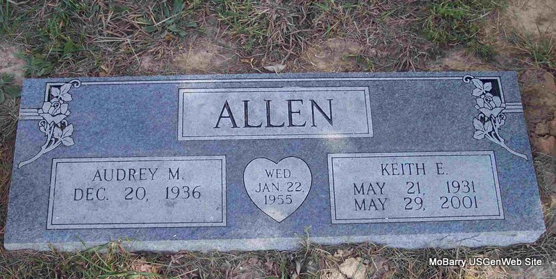 SSW: Audrey M. - Inscription:"Wed: Jan. 22, 1955" - Research Note: Son of Carl Charles Allen and Floy Eleanor Young. Served in the Marine Corp from 1952 until 1954. He was an assistant park ranger for the state of IA at Red Hawk State Park in Chariton, IA. He and Audrey moved to Allerton, IA where he worked at Bobwhite State Park as a park ranger until 1995, when he retired. After retirement, they moved to Cassville where they would be closer to their children. | Monett Times May 31, 2001 Mary Homesley Census Williamson Funeral Home Phyllis Long Photo Diana Cope |