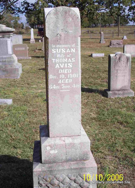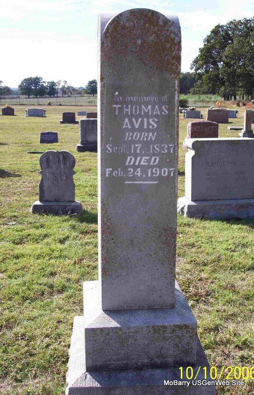 Research Note: Probably the son of Samuel Avis and Ann Mohler. - Cassville Democrat, May 25, 1907 - Probate Court Proceedings: Estate of Thos. Avis dec'd; proof of will established; John Elkins as executor, gave bond, approved. | Online Newspapers MO Death Records Census Phyllis Long Photo Diana Cope |