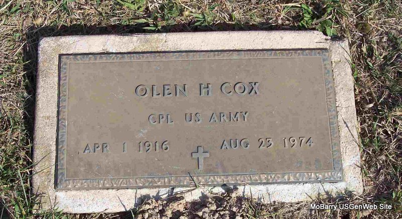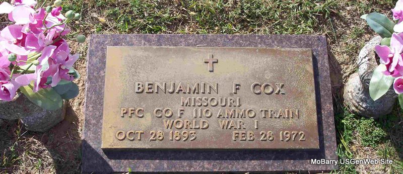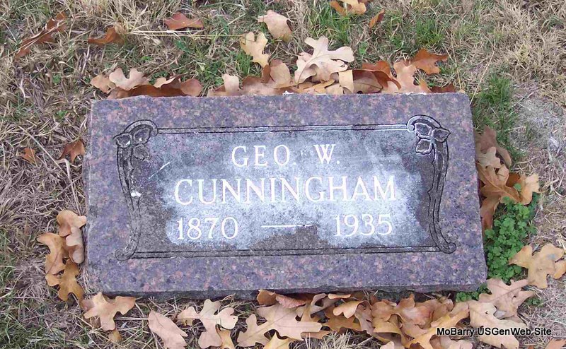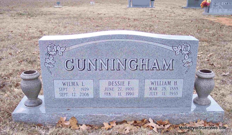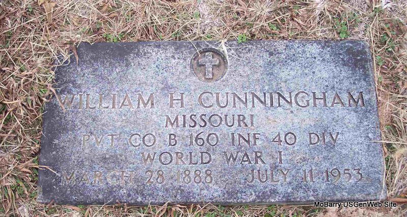 | CUNNINGHAM, William H. | Mar. 28, 1888 | July 11, 1953 | SSW: Wilma L. and Dessie F. - Research Note: Son of Thomas R. Cunningham and Elizabeth A. McCowan. - Military Stone - Inscription: "MISSOURI PVT CO B INF 40 DIV WORLD WAR I" | Census Phyllis Long Photo Diana Cope |