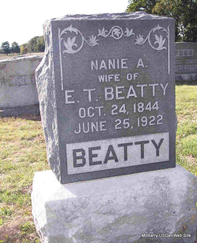 Inscription: "Wife of Ephraim T. Beatty" - Research Note: According to her death certificate her father was named Thomas and her mother's maiden name was Wilson, born in VA. It reads that her husband was E. J. Beaty and not E. T. as the stone reads. Her death certificate listed Nanie with two n's. E. J. (E. T.) Beatty of Monett gave the information. - 1900 Census, Flat Creek, Barry, Missouri - Ephraim T. Beatty, born Feb. 1856 TN, age 44, married 10 years, born TN, parents born TN; Nannie A., wife, born Oct. 1844 TN, age 55, married 10 years, no children, father born TN, mother VA; John A., son, born Apr. 1880 TN, age 20 (not the son of Nannie), parents born TN; Hoovess or Hoover, adopted son, born Nov. 1892 MO, age 7, father born unknown, mother MO. - Cassville Republican, Sept. 25, 1919 - Don Arnold of north of town, this week brought to E. T. Beatty's blacksmith shop a set of wagon wheels which were in Abraham Lincoln's inaugural parade. | Death Certificate Donna Cooper Online Newspapers Census Phyllis Long Photo Diana Cope |