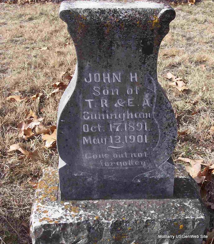 | CUNNINGHAM, John H. | Oct. 17, 1891 | May 13, 1901 | Inscription: "Son of T. R.& E. A." - Research Note: Son of Thomas R. Cunningham and Elizabeth Ann McCowan. | Note Phyllis Long Photo Diana Cope |