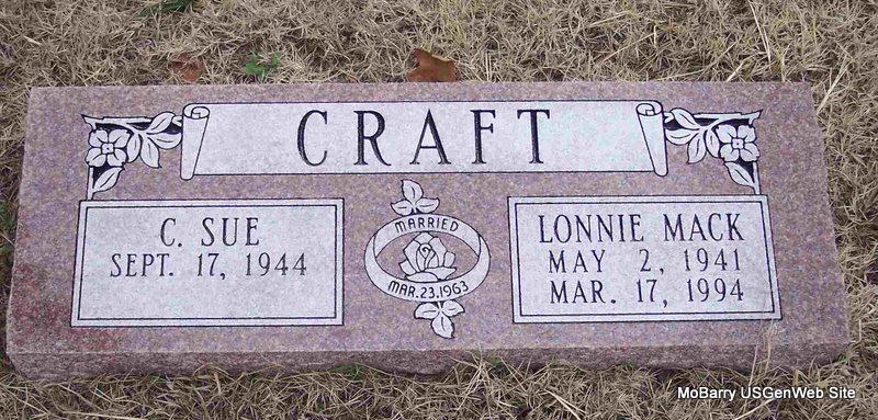 SSW: Lonnie Mack - Inscription:"Married Mar. 23, 1963" - Research Note: She was the daughter of Guy H. and Pearl Marie (Bolen) Couch. On March 23, 1963 in Monett, Missouri, she was united in marriage to Lonnie M. Craft, who preceded her in death on March 17, 1994. Also preceding her in death were her parents and one grandson, Brennan Allen Craft. Sue moved from Arkansas to Missouri in 1959 and graduated from Monett High School in 1963. | Fohn Funeral Home Phyllis Long Photo Diana Cope |