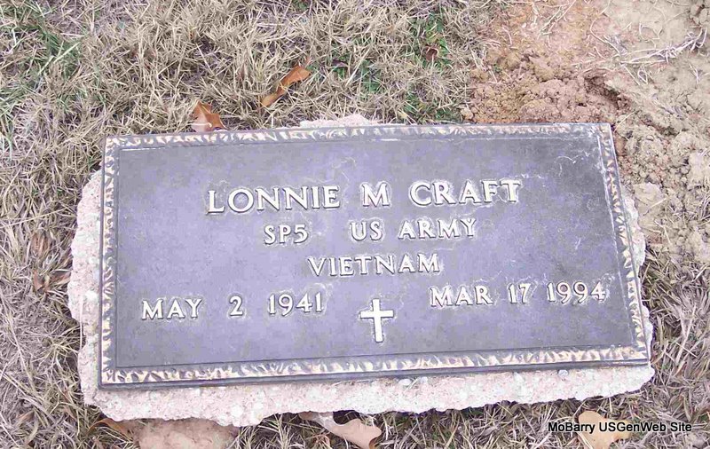 | CRAFT, Lonnie Mack | May 2, 1941 | Mar. 17, 1994 | SSW: C. Sue - Inscription:"Married Mar. 23, 1963" - Research Note: Son of George Craft and LuElla "Lula" Stansberry. - Another Stone - Inscription: "SP5 US ARMY VIETNAM" | Note Phyllis Long Photo Diana Cope |