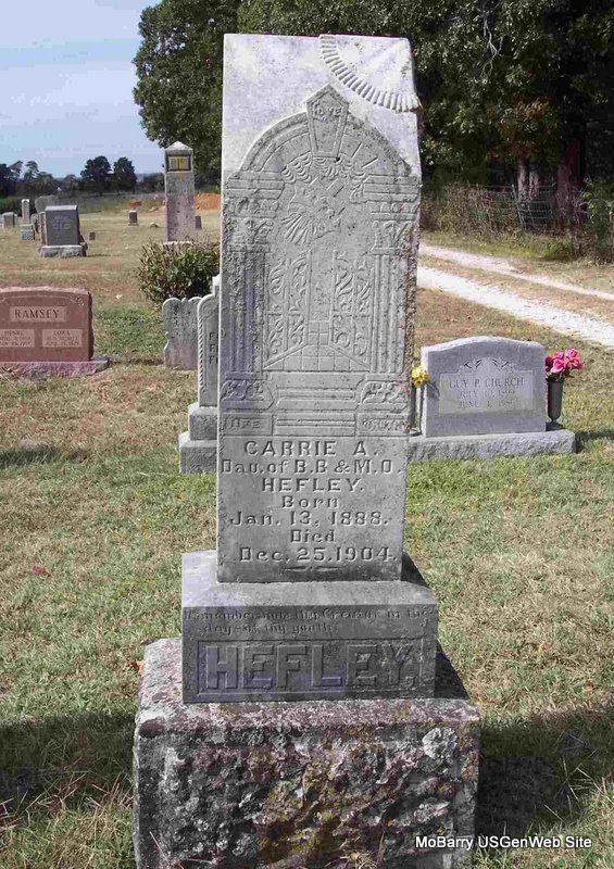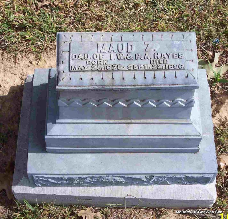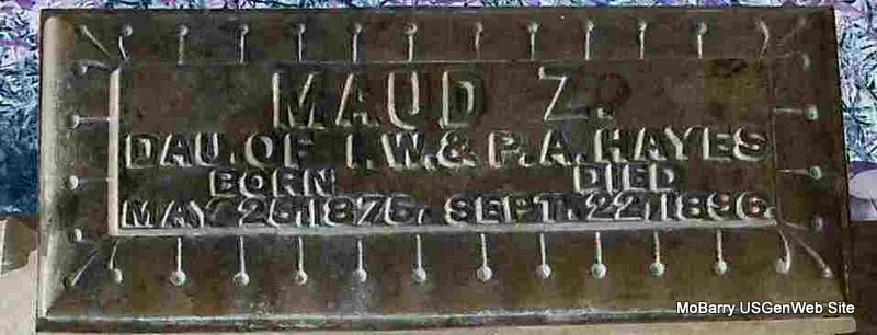 Inscription: "Dau. of I. W. and P. A. Hayes" - Research Note: Cassville Republican, September 24, 1896 - Report of the murder, on Sunday at Pasley, of Maud Hayes, daughter of Wash Hayes, by Benjamin Bethel of Cassville, who then committed suicide. Maude Hayes was the daughter of I. W. and Phoebe A. Hayes, born June 25, 1875 in Johnson Co., IN. She was buried at Huff Cemetery. Ben Bethel was born in Newton Co., MO, April 7, 1876 and came here with his father John Bethel and burial was at Cassville Cemetery. - Computer Enhanced Negative | Online Obit Phyllis Long Photo Diana Cope |