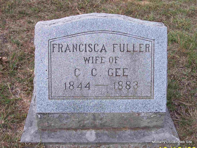 Inscription: "Wife of Charles C. Gee" - Research Note: Daughter of Ward Benjamin Fuller and Mariah Ann Collins. - 1880 Census, Mountain Twp., Barry Co., Missouri - Charles C. Gee, age 58, born NY; Frances A., wife, age 36, born WI; Susan M., daughter, age 16, born WI; Reuben W., son, age 11, born WI; Mary M., daughter, age 7, born MO; Martha A., daughter, age 4, born MO; Charles, son, age 1, born MO. Charles C. Gee was a Pvt. in the WI Inf. during the Civil War. He is in the 1890 Census. | Census Phyllis Long Photo Diana Cope |