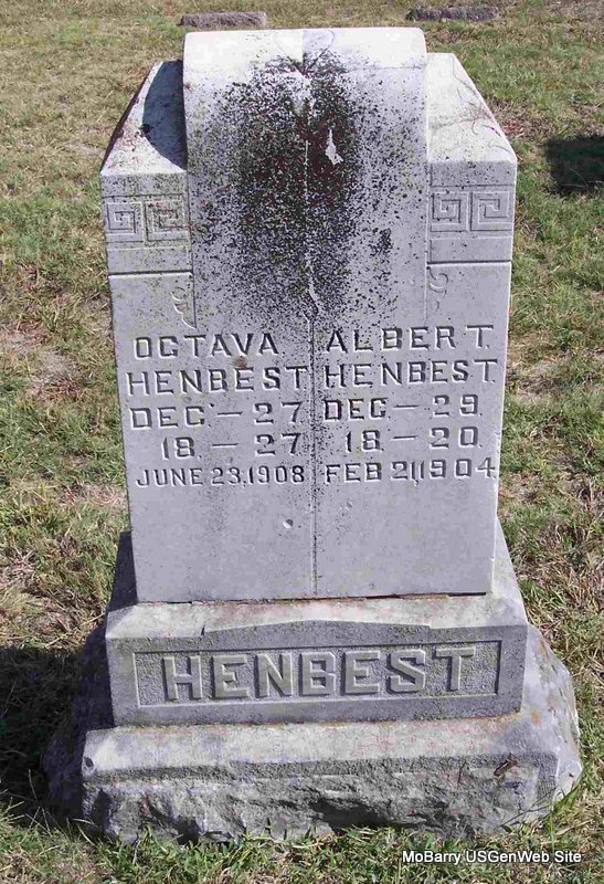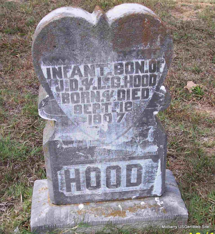 Research Note: In 1880 H. J., Armilda and children were living in Kings Prairie Twp., of Barry Co., MO. They were both reported born in IN and had 6 children listed. In some of the newspapers, H. J. was addressed as Rev. H. J. Hood. - He was widowed and a minister. Son of Robert Hood and Christina "Tennie" Rule, both born TN. W. A. Hood of Attica, KS was the informant on the death certificate. - May 27, 1897, Cassville Republican - Washburn Prairie News: Mamie Ellis and Goldie Arnold of Washburn are assisting H. J. Hood in berry picking. - July 29, 1897, Cassville Republican - Washburn Prairie News: H. J. Hood, son Bob and daughter Ora and Ethel, returned Saturday from Verona where they have been visiting for the past three weeks. - December 28, 1911, Cassville Republican - Washburn Prairie News: Clyde Puett and sister, Miss Gusta, of Roaring River, are spending the holidays with the family of Rev. H. J. Hood. - December 3, 1914, Cassville Republican - Roaring River News: Mrs. W. E. Puett received word Friday that her father, H. J. Hood of Aurora had his arm broken. The cause of his injury was not learned. | Death Certificate Census Note Donna Cooper Online Newspapers Phyllis Long Photo Diana Cope |