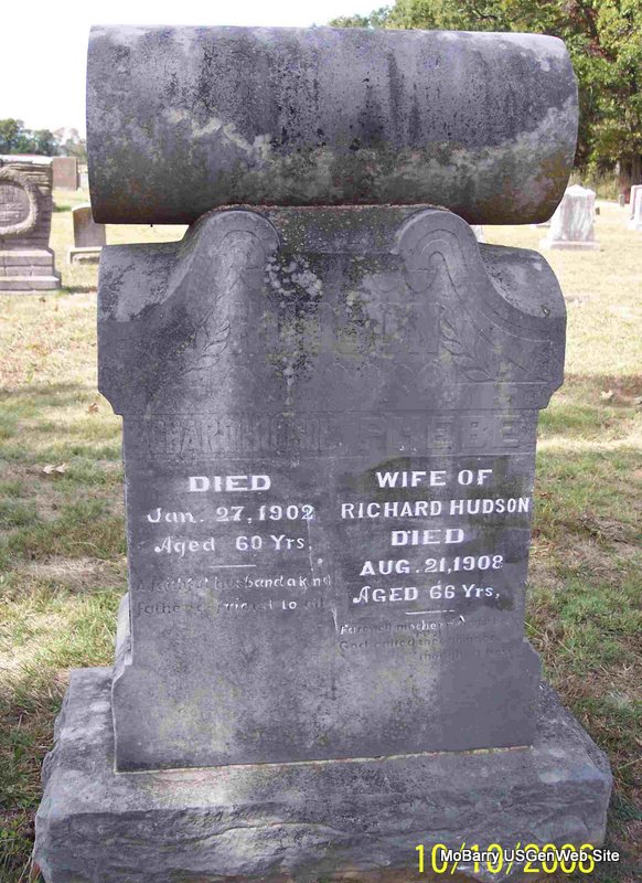 SSW: Richard - Inscription: "PHEBE WIFE OF RICHARD HUDSON DIED AUG. 21, 1908 AGED 66 YRS FAREWELL MOTHER, PEACEFUL BE THY, GOD CALLED THEE HOME, HE THOUGHT IT BEST." | Headstone Kathryn Gebczyk Photo Diana Cope |
