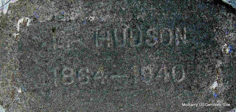 Research Note: Home made stone. - His wife was Nancy A. Hudson. Son of Richard and Phoeba Hudson. He was a professional gardener. His wife was the informant on the death certificate. - April 19, 1917, Cassville Republican - Lazarus Hudson and Chas. Anderson are at Pitcher, Okla. - August 11, 1917, Cassville Democrat - Mrs. Lazarus Hudson moved to Branson, Tuesday, to be with her husband. - Computer Enhanced Negative | Death Certificate Online Newspapers Phyllis Long Headstone Kathryn Gebczyk Photo Diana Cope |