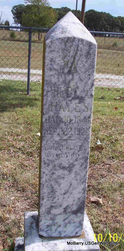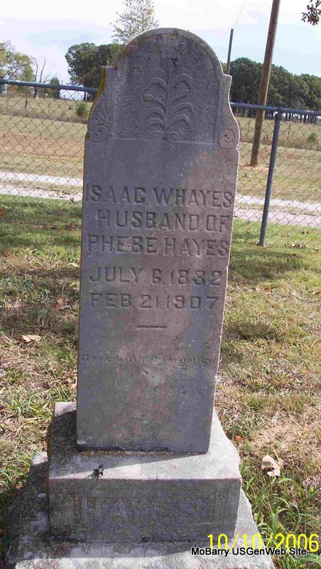 | HAYES, Isaac Washington | July 6, 1832 | Feb. 21, 1907 | Inscription: "Husband of Phebe Hayes" - Cassville Democrat, Feb. 23, 1907 - Washington Hayes of Pasley neighborhood, died, Thursday at 1 p.m. He was kicked by a horse some weeks ago, and his thigh broken, which caused his death. He was about 80 years old and leaves a wife and three daughters, Mrs. Geo. Owings, Mrs. Elam Davis and Mrs. Chas Sills of this county. The remains were laid to rest yesterday in the Huff Cemetery. He was a good citizen and will be greatly missed in that community. | Online Obit Phyllis Long Photo Diana Cope |