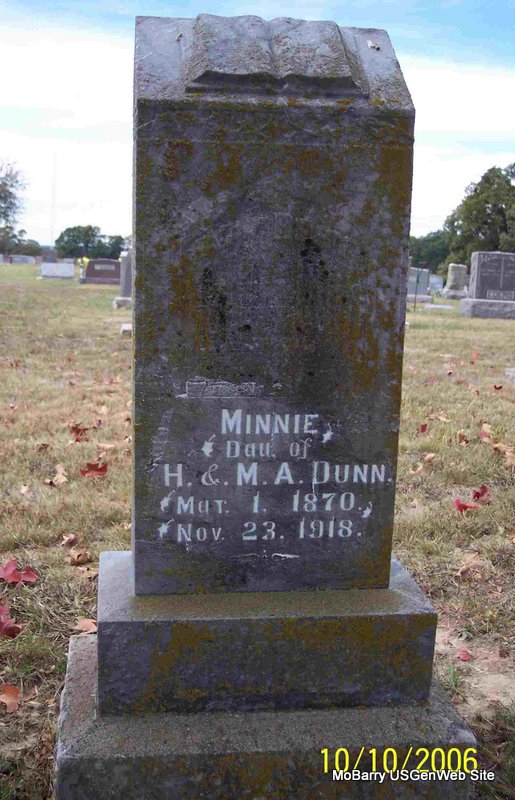 | HUNT, Minnie (DUNN) | Mar. 1, 1870 | Nov. 23, 1918 | Inscription: "Dau. of H. and M. A. Dunn" - Research Note: Daughter of Henry Dunn and Mary Forester - Cassville Republican, Nov. 28, 1918 - Mrs. Minnie Hunt, wife of Willard Hunt, died Saturday evening, November 23, at the home of her parents, Mr. and Mrs. Henry Dunn, five miles southeast of Cassville, of lung trouble. Mrs. Hunt had been a sufferer for a long time and had borne it with Christian fortitude and passed peacefully away surrounded by many of her loved ones. The funeral services were held Sunday afternoon, conducted by Rev. Will Ireland, and interment made in the Corinth cemetery. Minnie Dunn Hunt was born in Barry county near Washburn March 1, 1870. She was the oldest daughter of Mr. and Mrs. Henry Dunn. Most of her life was spent in this county and at Aurora. The family lived for some time in Oklahoma. She leaves husband and three children, two sons and a daughter. | Online Newspapers Phyllis Long Photo Diana Cope |