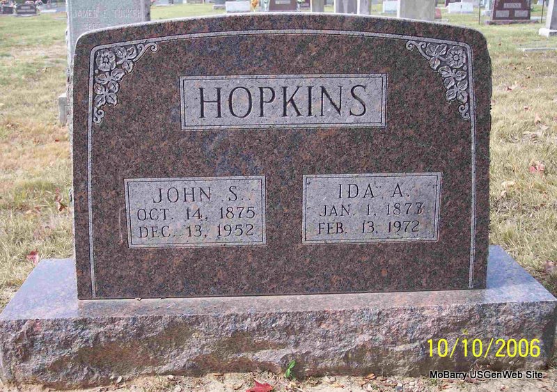 SSW: Ida A. - Research Note: Married to Ida Dunn. Children: Jewel, (1897-1899) Beulah, (1901-1902) Rolland, Mary Catron, Gail, W. K., Hazel Hankins, Ted, and Reva McGruder. His death certificate reads that his parents were Andy J. and Hannah Hopkins. - Funeral services for John Sterling Hopkins, native resident of the Washburn Prairie community who passed away at his home in the community last Saturday afternoon, were held at the Corinth Baptist Church Tuesday afternoon with the Rev. Chas. Vanzandt officiating assisted by the Rev. Ab Edie. Mr. Hopkins, who had lived his entire life in that community, was 77 years of age. He retired from farming several years ago. His father, the late A. J. Hopkins was one time Sheriff of Barry County many years ago. He had been in ill health for several months. Survivors include: his wife, Mrs. Ida Hopkins of the home: four sons, Ted, Gail, Rolland and W. K., all of that community; and three daughters, Mrs. Mary Catron of Exeter, Mrs. Reva McGruder of Wayne, and Mrs. Hazel Hankins of Pittsburg, Calif. He is also survived by two sisters, Mrs. K. F. Howell of Tulsa and Mrs. Lula Wertz of Cassville; one brother, A. J. of Parma, Idaho. Musical selection were furnished at the service by a quartet composed of J. D. Smith, Loyce Hopkins, Ralph Davis and Emory Melton, accompanied by Mrs. Eldon Robb at the piano. Burial was in the Corinth cemetery under direction of the Koon Funeral home. | Obituary Sue Hopkins Stiles Death Certificate Donna Cooper Koon Funeral Home Phyllis Long Photo Diana Cope |