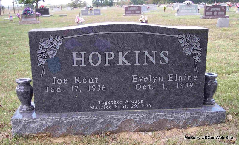 | HOPKINS, Evelyn Elaine (WADE) | Oct. 1, 1939 | No Date | SSW: Joe Kent - Inscription: "Married Sept. 29, 1956" - Back of Stone | Photo Diana Cope |