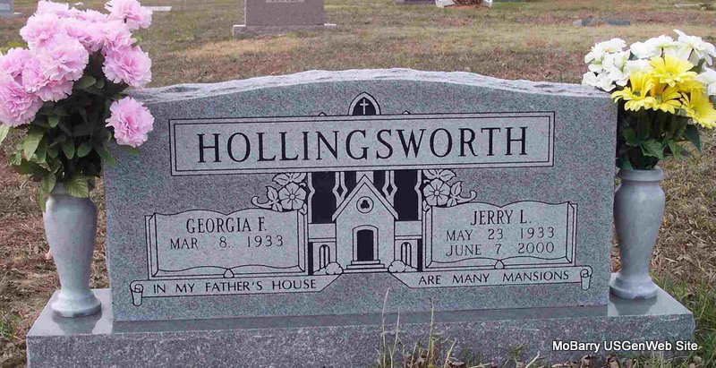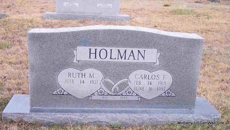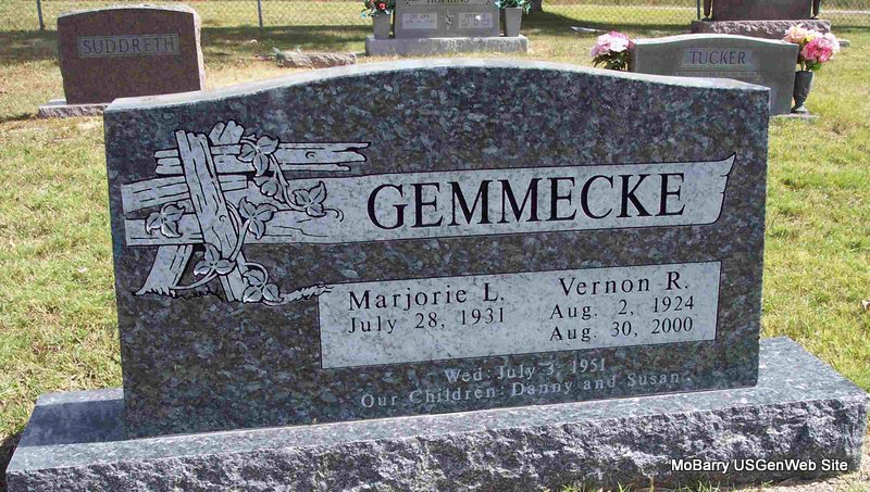 SSW: Vernon R. - Inscription: "Married July 3,1951" - Research Note: She was the daughter of J. Tillman Maloney and Effie Mae Moon Maloney. She was a cook/bus driver for the Southwest School District in Washburn, Missouri and worked at Harold's Package Store in Seligman. She was a member of the Garfield Baptist Church in Garfield. She is preceded in death by her parents; her husband, Vernon Ray Gemmecke; a son, Danny Ray Gemmecke; sisters, Ruby Redenbaugh and Pauline Schooley and a grandson, Jonathan Gemmecke; a granddaughter, Mandy Litchfield. Survivors are a daughter; a brother; four grandchildren and bonus grandchildren. | Sisco Funeral Home L. Pearce headstone photo on Findagrave |