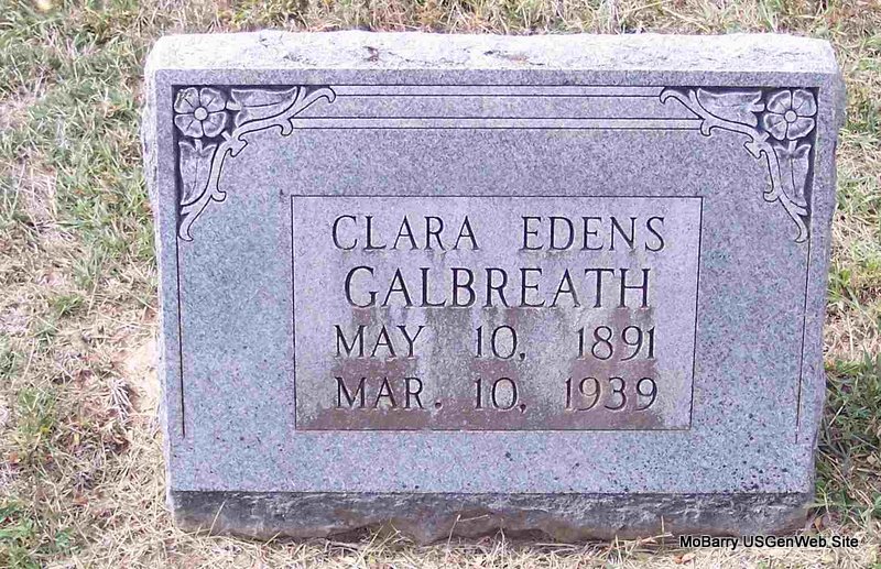 | GALBREATH, Clara (EDENS) | May 10, 1891 | Mar. 10, 1939 | Research Note: Daughter of Columbus W. Edens and Tennessee Vanzandt. | Census Phyllis Long Photo Diana Cope |