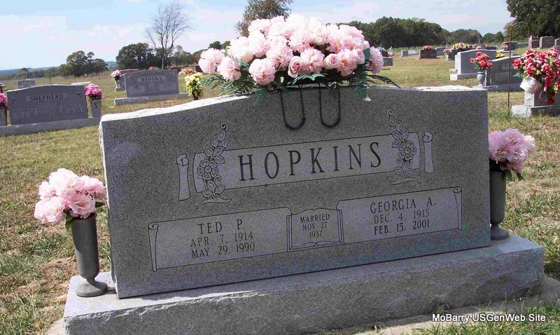 SSW: Ted P. - Inscription: "Married Nov. 27,1937" - Research Note: Wife of Ted Hopkins, mother of Lanny Hopkins, Judy Cooper, Sue Stiles. Stone reads Feb. 15, 2001 for a death date, Sue posted Feb. 14, 2000 for a death date. - She was the daughter of W. A. and Cora (Jackson) Williams. She attended House Elementary School near Cassville and Wichita High School in Wichita, Kansas. She married Ted P. Hopkins on November 27, 1937, and he preceded her in death May 29, 1990. | Obituary Sue Hopkins Stiles Monett Times Phyllis Long Photo Diana Cope |