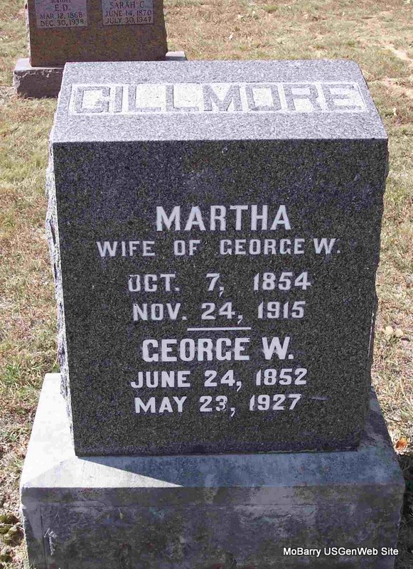 SSW: George - Inscription:"Wife of George" - Research Note: According to Martha's death certificate she was a daughter of John and Jane (Lewis) Barker and was born in Hillsdale, Michigan. Her death certificate gives the year of her birth as 1853. Dr. D. L. Mitchell submitted the information. - December 2, 1915, Cassville Republican - Mrs. George Gilmore Dead: Mrs. George Gilmore died at their home 5 miles southeast of Cassville, Wednesday afternoon, Nov. 24, age 61 years, one month and 17 days. Mrs. Martha (Barker) Gilmore was born in Hillsdale County, Michigan, Oct. 7, 1854. She was a daughter of Mr. and Mrs. John Barker of Cherryvale, Kan., former residents of the Pasley neighborhood south of Cassville. She was married to George Gilmore in 1874. Six children were born to them. The five living are: Mrs. Mae Ruddick and Mrs. Ida Reams of Oklahoma, Mrs. Elsie Ashley of Idaho, John of Kansas and George at home. She had an attack of pneumonia from which she had practically recovered when uremic poison set up which cased her death. Mrs. Gilmore was a member of the Christian church and was estimable lady. The funeral was held Friday afternoon at the Corinth Baptist Church, conducted by Eld. Ed Vanderpool and her body laid to rest in the cemetery nearby. - August 4, 1917, Cassville Democrat - Flatwood: Grandma Barker, of Cherryvale, Kan., is visiting at the home of George Gilmore and other friends in this neighborhood. - March 7, 1912, Cassville Republican - Mrs. George Gilmore south of town received a message Friday stating that her mother, Mrs. John Barker, who lives at Cherryvale, Kan., was dangerously ill with pneumonia. Mrs. Barker is advanced in years and it is feared that she will not recover. - Another Photo | Death Certificate Donna Cooper Online Newspapers Phyllis Long Photo Darla Marbut Photo Diana Cope |
