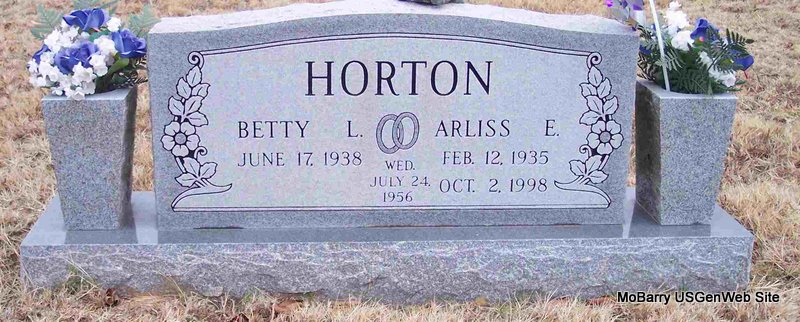| HORTON, Arliss E. | Feb. 12, 1935 | Oct. 2, 1998 | SSW: Betty L. - Inscription: "Wed July 24, 1956" - Research Note: Son of Roy and Mae Horton. | Census Phyllis Long Photo Diana Cope |
