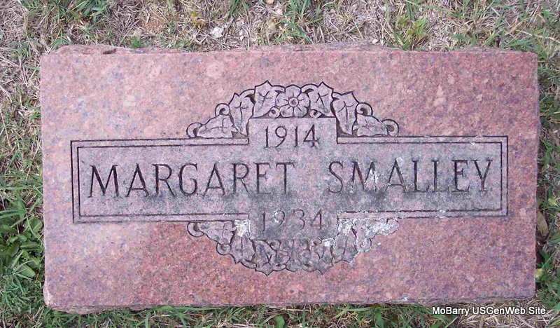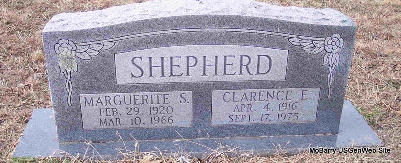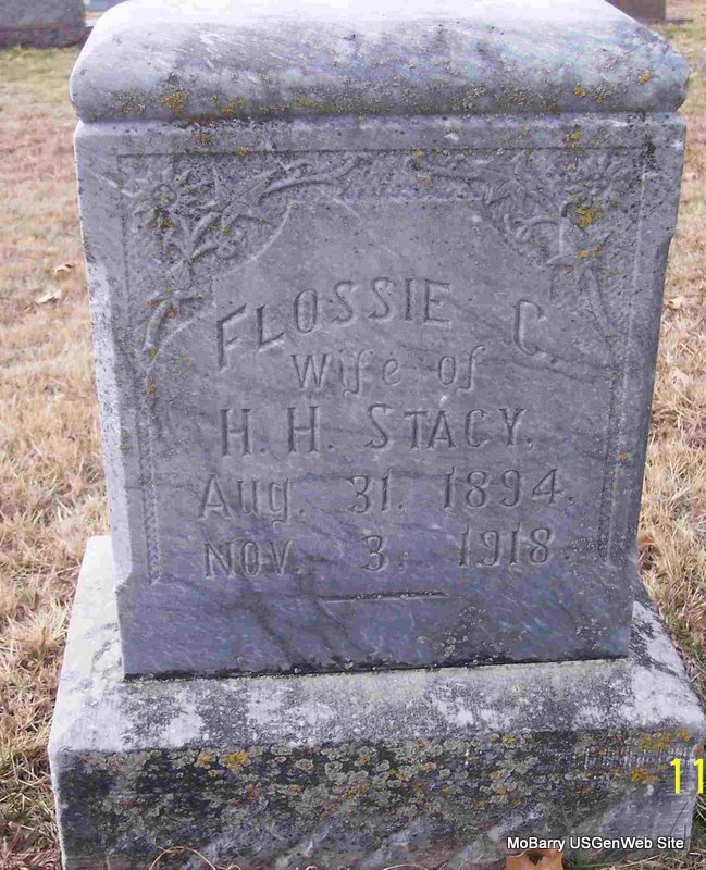 | STACY, Flossie C. (FISHER) | Aug. 31, 1894 | Aug. 3, 1918 | Inscription: "Wife of H. H." - Research Note: Horace H. Stacy, age 19, married Flossie C. Fisher, age 20, on Dec. 7, 1914 in Barry Co., MO. J. T. Stacy, father of Horace, gave consent. Daughter of Rever Rado Fisher and Martha Jane Weston, both buried at Corinth Cemetery. | MO Marriage Records Census Phyllis Long Photo Diana Cope |