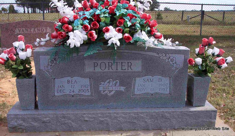 SSW: Sam D. - Inscription:"Mar. 3, 1931" - Research Note: Lyda Beatrice "Bea" Porter, 93, of Washburn, died December 24 at the home of her son in Exeter. She was the daughter of Henry J. and Xzan (Wiley) Johnson. She married Sam Porter on March 3, 1931, and he preceded her in death. Survivors include four sons, five daughters, one sister, 18 grandchildren, 21 great grandchildren, and 11 great great grandchildren. She was preceded in death by one son, James Porter; five brothers, three sisters, a grandson, Carlin, and a daughter-in-law, Patsy Porter. | Fohn Funeral Home Phyllis Long Photo Diana Cope |